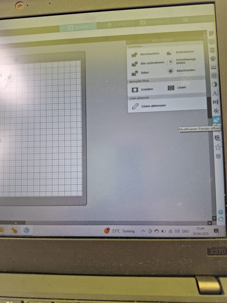 Ganz oben steht „verschweißen“. Dieser Schritt ist sehr wichtig, da die Schrift falsch geschnitten wird.